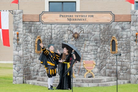 Following the closing prayer, students filed back to their rooms to change into picnic attire and enjoy some Florida sunshine. This year, Eagle Field boasted a Renaissance Faire. There was feasting and merriment which included jousting, archery, axe-throwing, and more. Special skits were performed by minstrels, inviting mirth across the green.